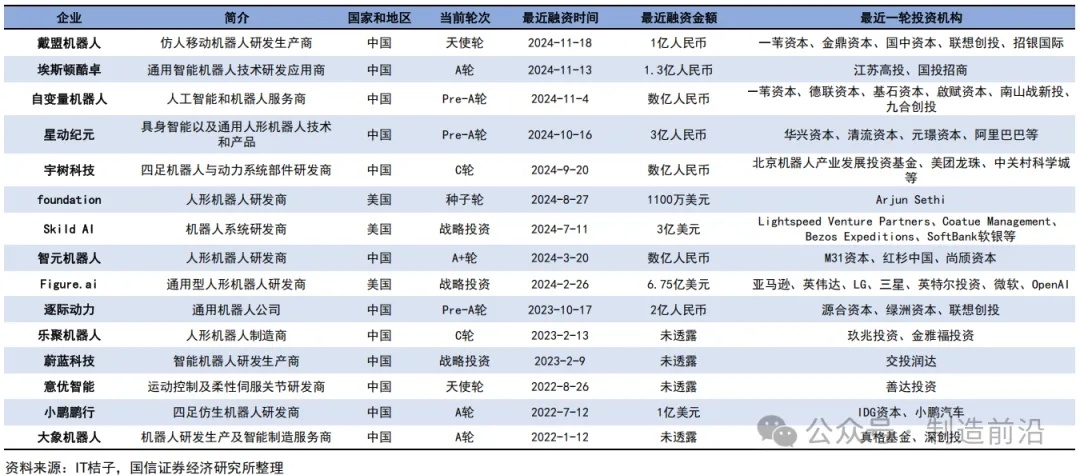 从近三年全球人形机器人领域投融资情况来看,人形机器人赛道融资热度持续升温。备受资本看好的领域包括整机制造,以及灵巧手、伺服电机、减速器、传感器等关键零部件。从融资企业来看,大部分企业处于发展早期阶段,资本的持续进入将为人形机器人的发展 注入强劲动力,预计未来几年人形机器人与具身智能相关的企业将会持续增加。在此过程中,中国人形机器人产业进入发展的提速期。