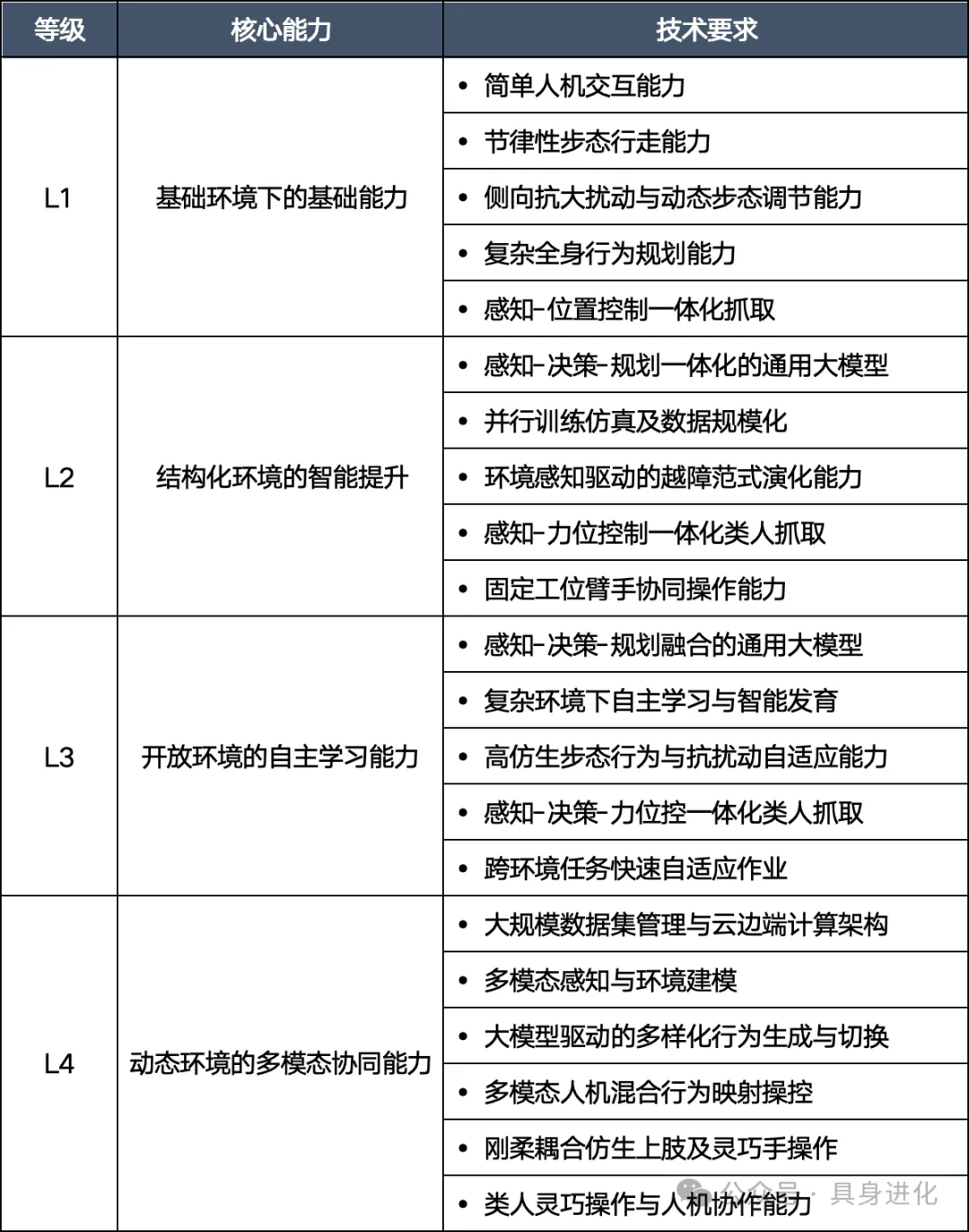 3级技术等级(Level3,L3)人形机器人具有在开放环境中进行具身智能高程度应用、高仿生高韧性自主运动、高效自主作业的能力。