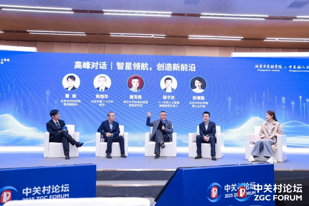 “智星领航,创造新前沿”对话环节由北京中关村学院常务副院长董彬主持,北京市第二十中学校长陈恒华、清华大学未来实验室首席研究员唐克扬、十一学校人工智能高端课程负责人郑子杰以及北京中关村学院博士生代表张博雅等嘉宾共同探讨了人工智能时代的教育变革与人才培养。嘉宾们表示,未来教育需深度融合技术与人文,基础教育应坚守人性土壤,培养技术与价值的双重守护者。