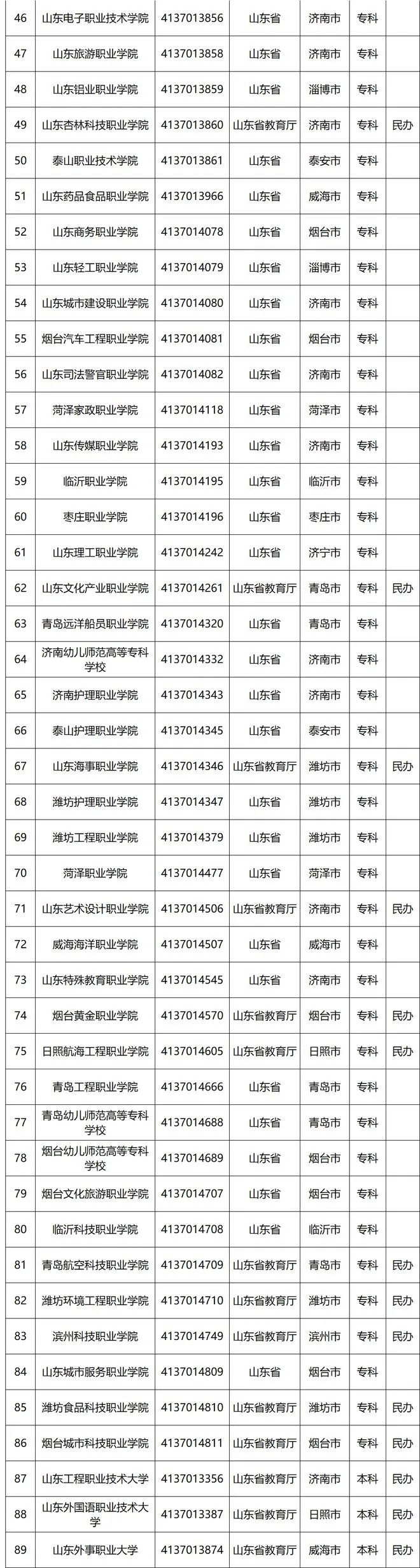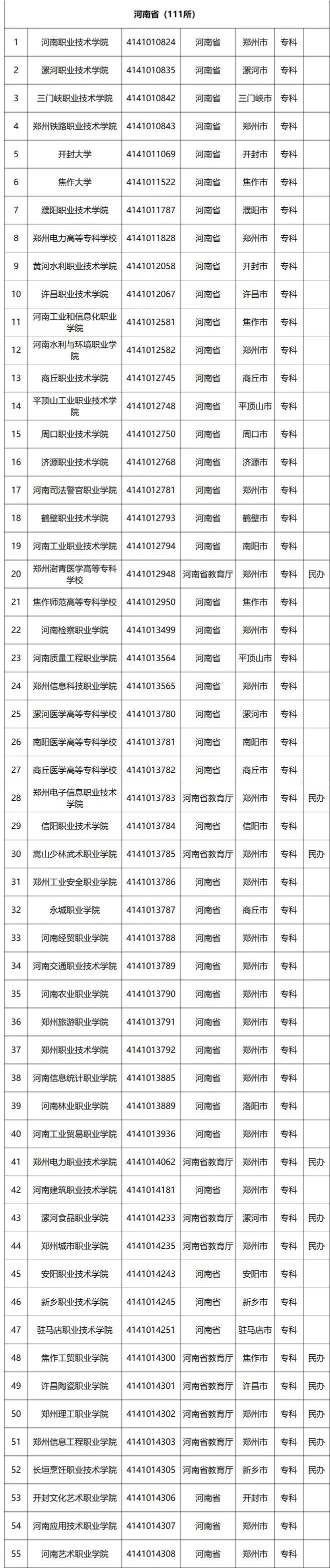 截至2023年6月15日,全国高等学校共计3072所,其中:普通高等学校2820所,含本科院校1275所、高职(专科)院校1545所;成人高等学校252所。本名单未包含港澳台地区高等学校。据统计,截至2023年6月15日,全国高等职业院校共计1578所(较2022年新增57所),其中:专科层次职业学校1545所,本科层次职业学校33所。根据最新全国高等学校名单,截至2023年6月15日,全国高等职业院校共计1578所,其中:专科层次职业学校1545所,本科层次职业学校33所。公办职业学校共1181所,民办及中外合作办学学校共397所。与2022年相比,全国高等职业院校共新增57所。其中,河南省新增学校数最多,共新增11所;其次,湖南、新疆各新增7所,云南新增6所,河北、上海各新增4所。 最新全国高等职业院校名单