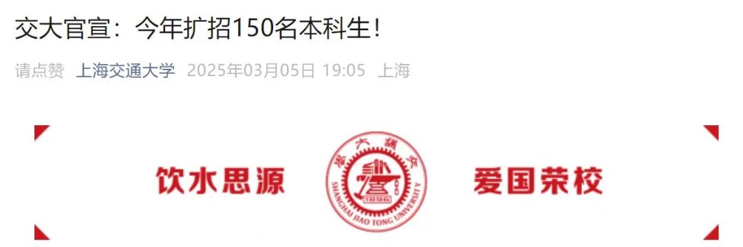 3月5日,上海交通大学宣布2025年将继续增加150名本科招生名额,主要集中在国家最紧缺的前沿学科,扩大人工智能、集成电路、生物医药、医疗健康、新能源等学科领域的招生规模。学校首批建设357门AI课程,新立项建设168门AI课程及15个跨学科AI微专业,重塑课程体系与培养目标。