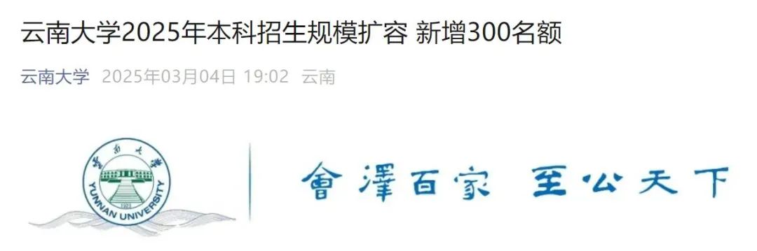 3月4日,云南大学发布消息称,2025年将继续扩大招生规模,拟增加300个本科招生名额,本次扩招主要强化理工农医类学科布局,着力培养直接服务于国家、地方经济与产业发展需求。
