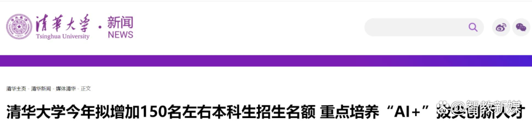 3月2日,清华大学决定有序适度扩大本科招生规模,2025年拟增加150名左右本科生招生名额。清华大学发挥学校学科资源优势,立足人工智能与多学科交叉,将成立新的本科通识书院,新增本科生将进入新书院学习,新书院将以培养具备AI思维、胜任AI技术、具有AI与不同学科深度交叉知识素养的复合型人才为目标。