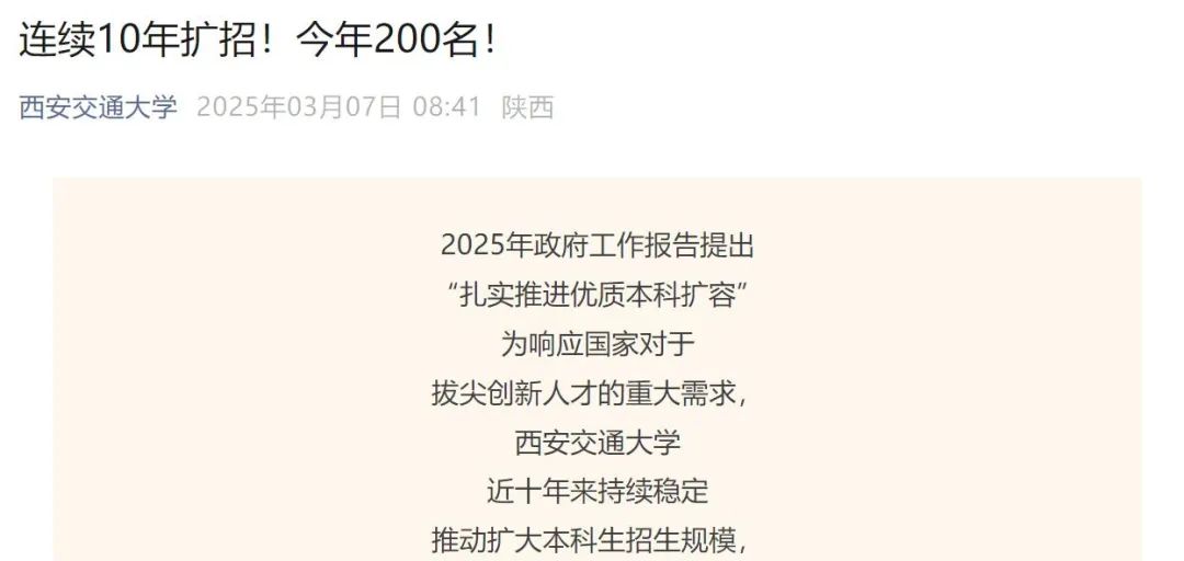 3月7日,西安交通大学发布扩招通知!学校将继续扩招200人,招生规模将达到6350人。这也是西安交通大学连续第10年扩招。2025年将继续扩大人工智能、信息技术、储能技术、电气能源、医工交叉等学科领域的招生规模。