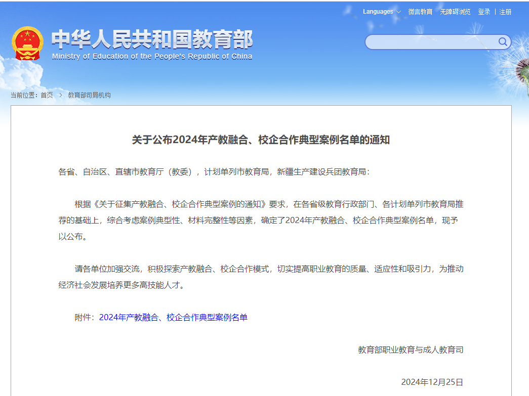 根据《关于征集产教融合、校企合作典型案例的通知》要求,在各省级教育行政部门、各计划单列市教育局推荐的基础上,综合考虑案例典型性、材料完整性等因素,确定了2024年产教融合、校企合作典型案例名单,现予以公布。